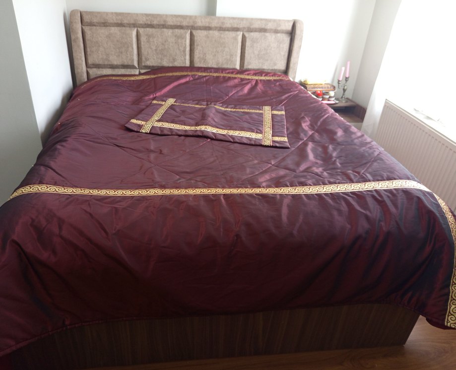 Parlak bordo kumaş ve işlemeli desenlere sahip yatak örtüsü, yatak odanıza şık bir dokunuş katar. Uyumu sağlayan yastık kılıfı dahildir. ️Az kullanılmıştır.Sayılı..