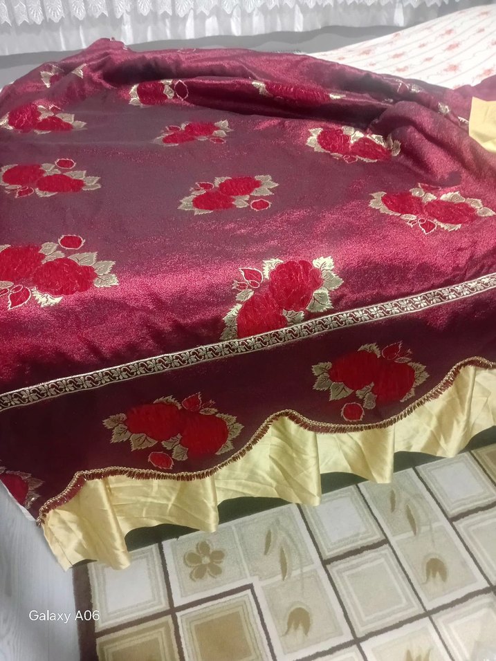 Bordo renkli, parlak kumaştan yapılmış, işlemeli çiçek desenleri ve süslü bordürü olan yatak örtüsü. Görüntüde 'Galaxy' yazısı yer alıyor.