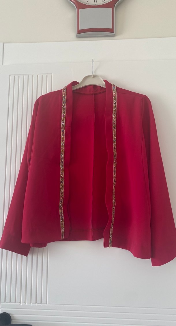 Özel tasarımdır 44 46 beden Sitemde buna benzer dört adet blazer ceket vardır onlara da bakmanizi öneririm toplu almak isterseniz yardımcı olurum Bordo renkli, uzun boy, notched lapel yakalı ve işlemeli detaylara sahip kadın ceket. İpek gibi kumaştan, salaş kesim ve uzun kollu, bohem tarz için uygundur.