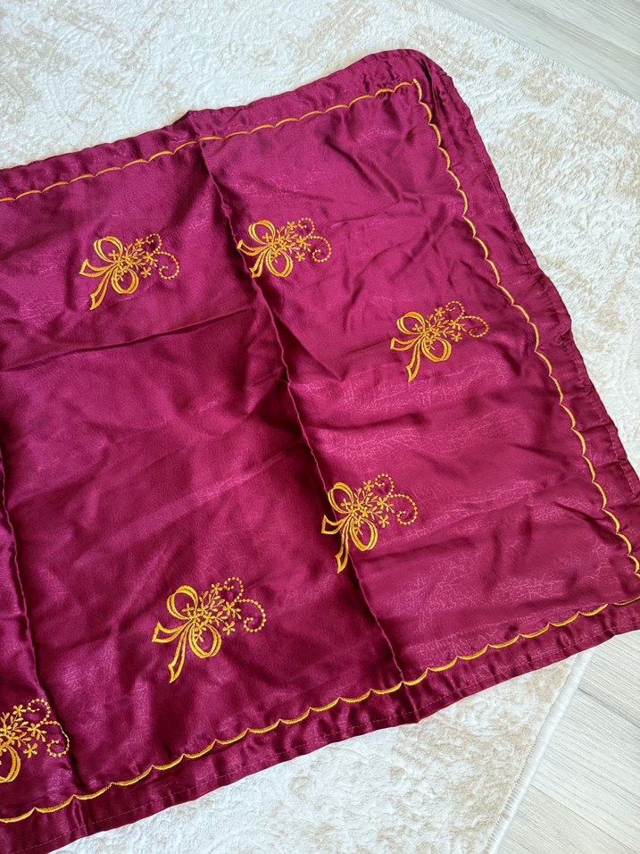 Bordo renkli parlak kumaş ve sarı işlemeli desenlerle süslenmiştir. Geleneksel tarzda çeyizlik seccade. ️