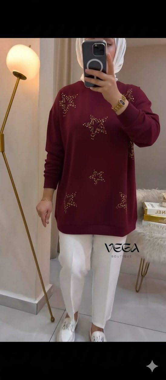 Bordo renkli, işlemeli yıldız desenli triko tunik. Salaş kesim, uzun kollu ve yuvarlak yaka. Günlük rahat kullanıma uygun, parlak görünümlü.