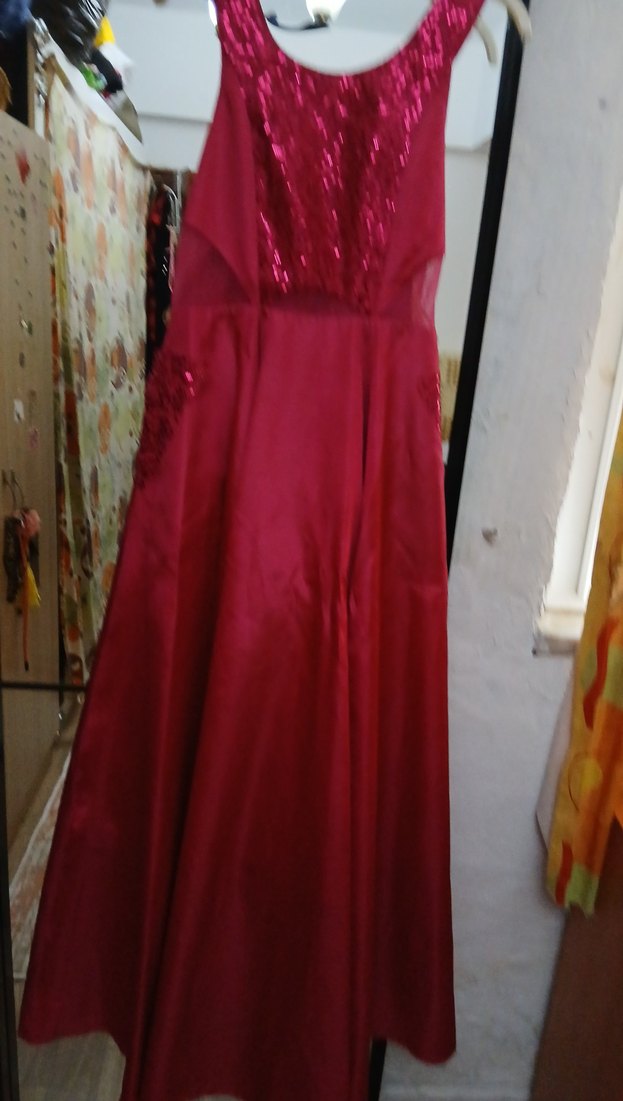 Bordo renk, işlemeli ve drapeli detaylara sahip, v yaka ve kolsuz uzun abiye elbise. Parlak kumaşıyla düğünler için uygun, şık ve klasik tarzda.