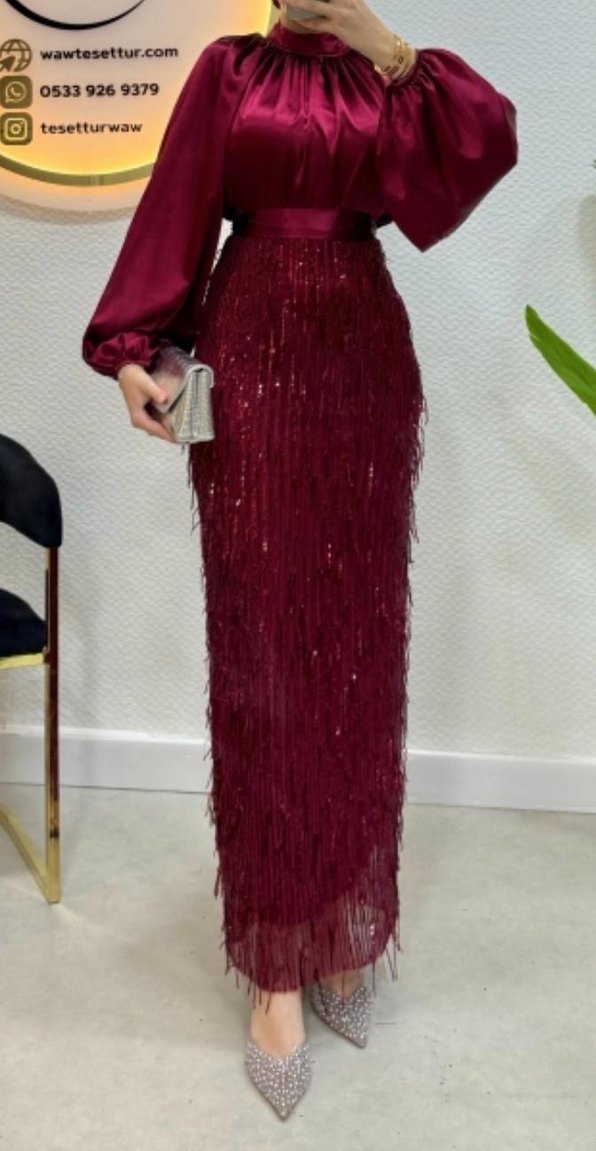 Bordo renkli, işlemeli, uzun ve vücuda oturan abiye elbise. Drapeli detaylar, uzun kollu ve V yaka tasarım. Parlak görünümüyle şık bir parti elbisesi. ✨