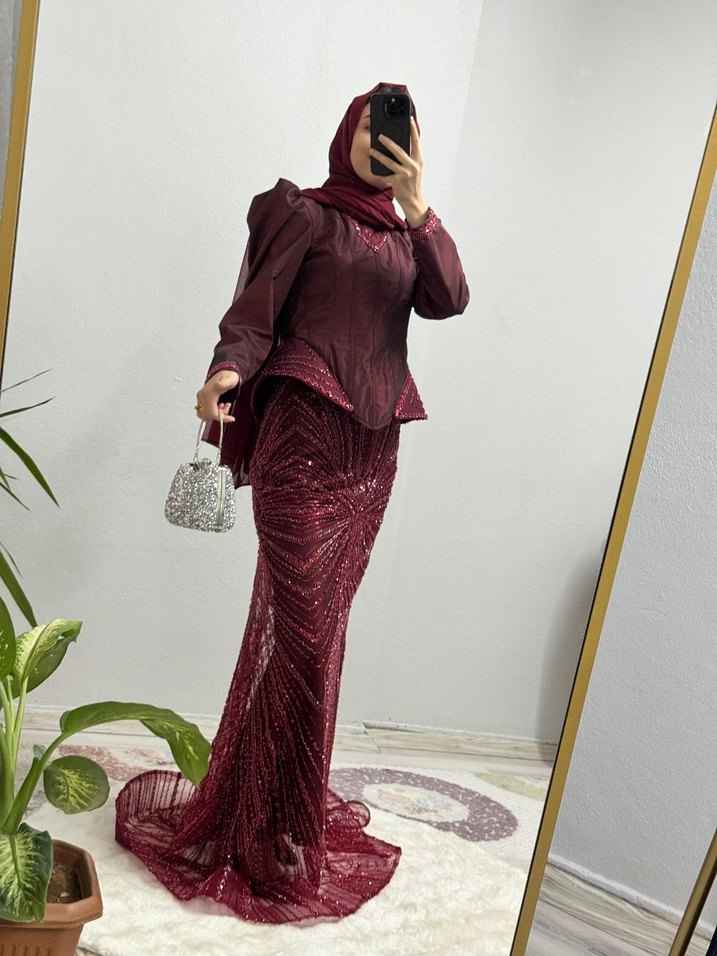 Bordo renkli, işlemeli ve drapeli detaylara sahip uzun abiye elbise. Yüksek yakalı, uzun kollu, modest ve parlak dokusuyla düğünler için uygundur. Özel Dikim ABİYEDİR sıfır üründür Satılıktır
