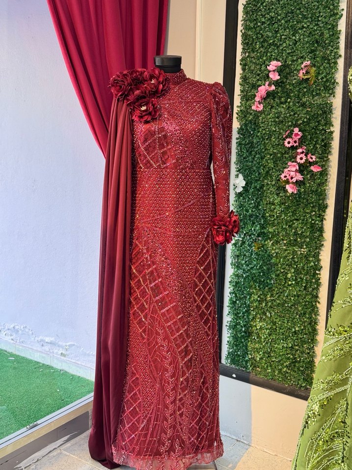 Bordo renkli, yüksek yakalı ve uzun kollu işlemeli uzun abiye elbise. Düzenli kesim, drapeli detaylar ve çiçek süslemeleri ile düğünler için uygun. ✨