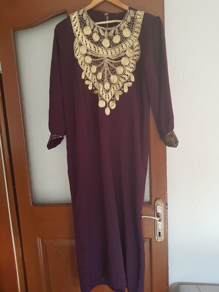 Bordo renkli, uzun kollu ve V yakalı, bol kesim bohem elbise. İşlemeli ve boncuk detaylarıyla, ipeksi kumaştan günlük kullanım için uygundur. iki kol arası 53 cm kol uzunluk 54cm boy uzunluk 1.38 cm