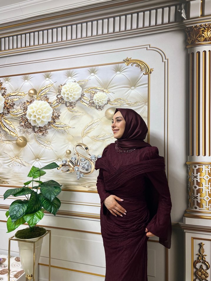 Bordo renkli, işlemeli desenlere sahip uzun ve parlak dokulu kadın abiye uzun kollu ve rahat kesimlidir. ✨ Şalı dahil değildir Şalı isteyen 300 TL ürün 44 bedendi belinden  üç parmak aldırdım bir defa giyildi