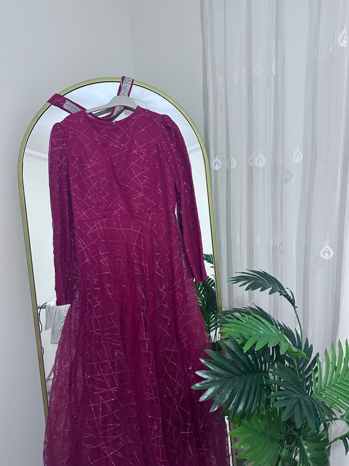 Bordo İşlemeli Uzun Kadın Abiye Elbise