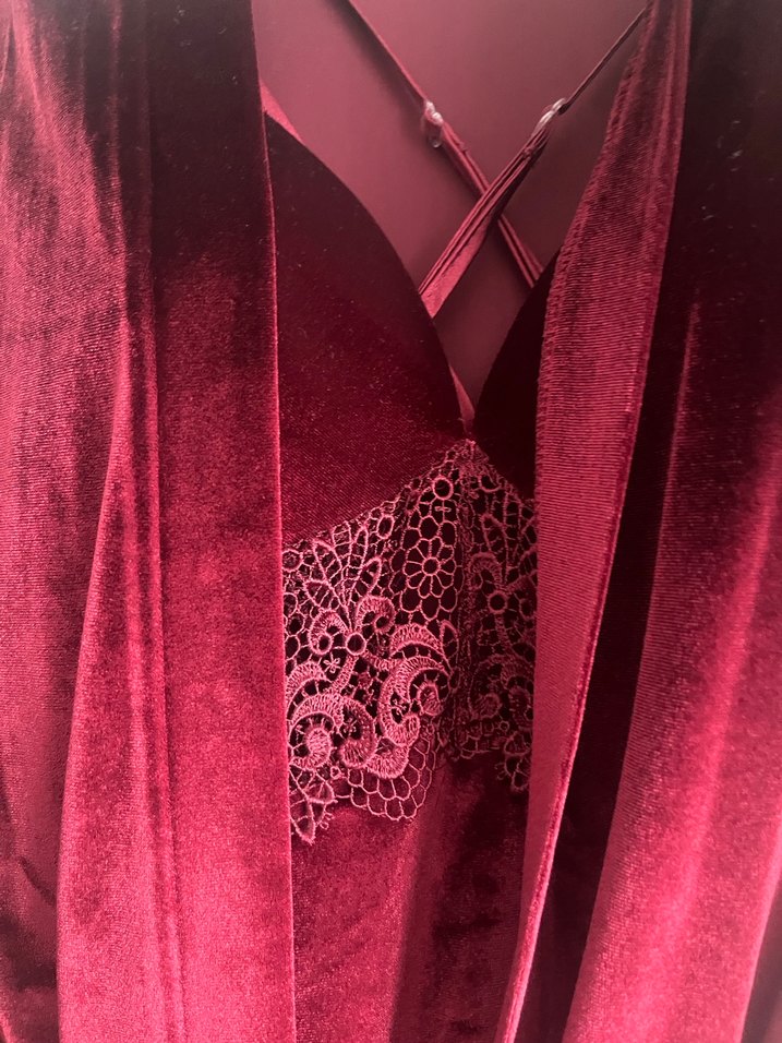 Bordo renkli, işlemeli ve ince askılı uzun kadife gecelik, fit kesimiyle göz alıcı ve gotik tarzda tasarlanmıştır.
