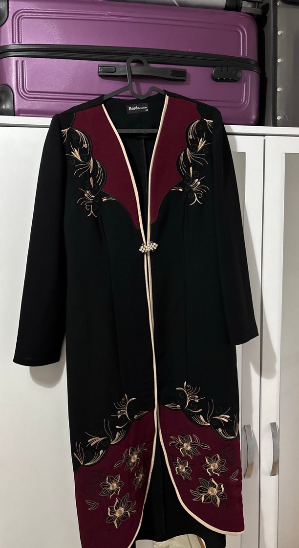 Uzun, bordo ve siyah renklerde işlemeli çiçek desenli, yaka detaylı kadın kaban. Uzun kollu, VATKALI