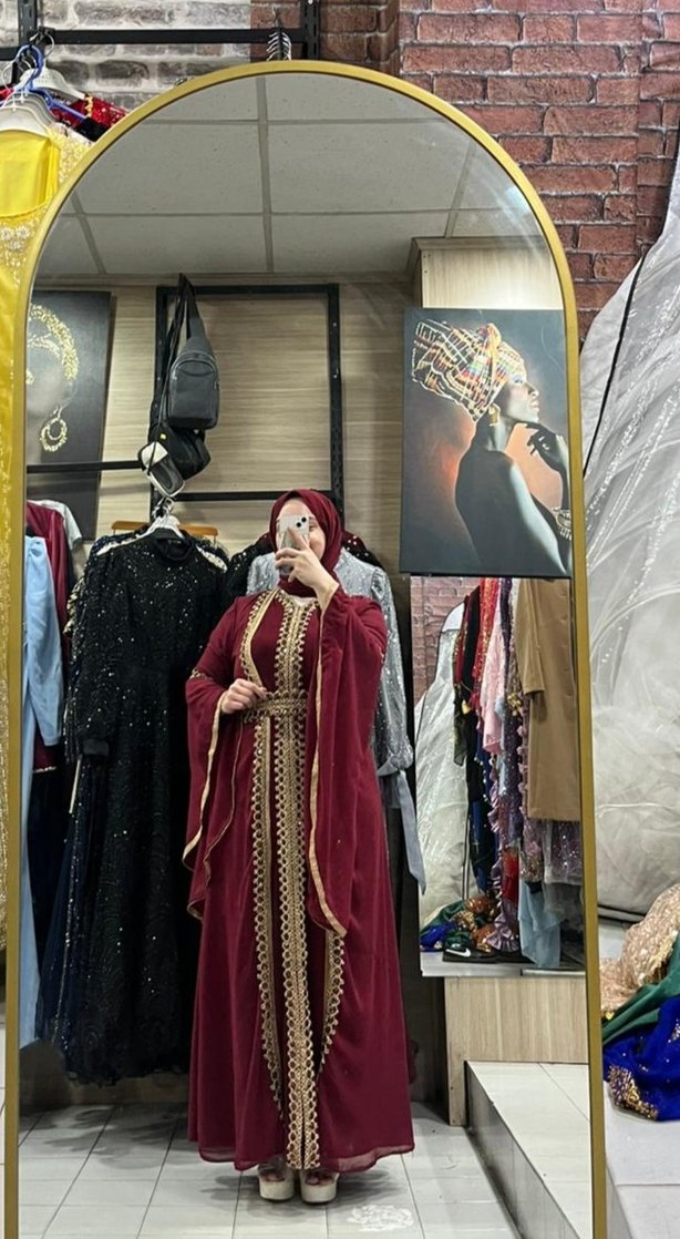 Bordo renkli, yüksek yakalı ve uzun kollu bu henna elbise, bol kesim ve drapeli detaylara sahiptir. İşlemeli desenleriyle, modest ve bohem tarzda düğünler için uygun.
