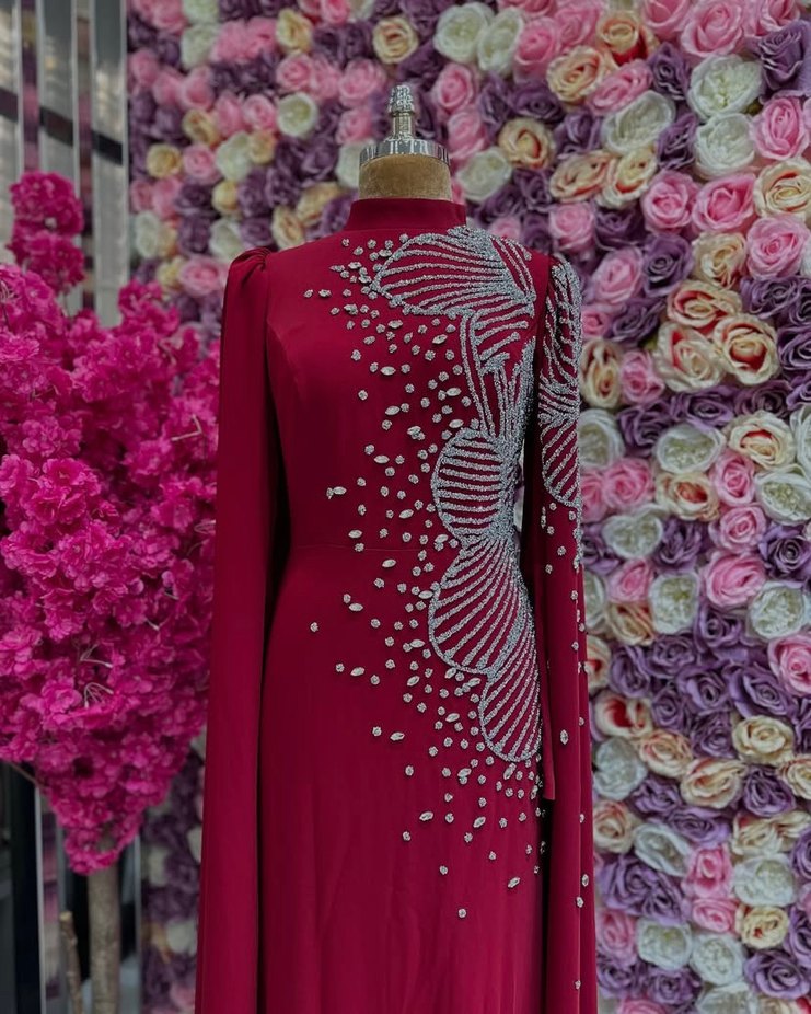 Bordo renkli, işlemeli, yüksek yakalı ve uzun kollu bu uzun abiye elbise, çağdaş ve regular fit kesimiyle düğünler için uygundur. ✨