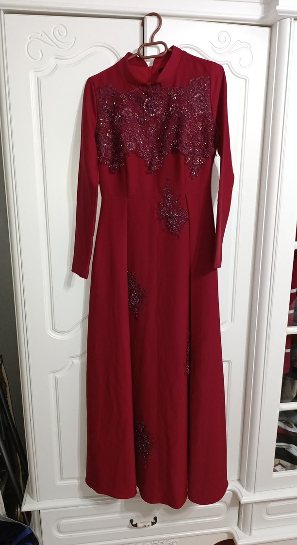 Bordo renkli, yüksek yakalı ve uzun kollu bu uzun elbise, işlemeli detaylara sahip drapeli ve incecik kumaftan yapılmıştır. Düğünler için uygundur.