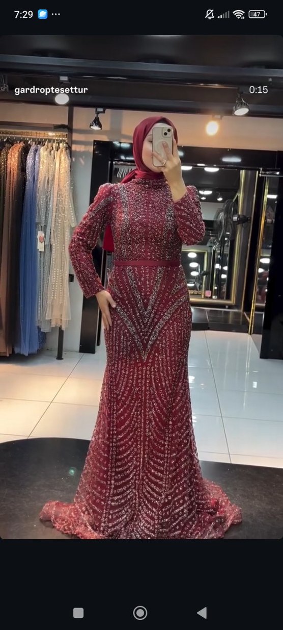 Bordo renkli, uzun kollu ve V yakalı bu abiye elbise, işlemeli desenleri ve parlak kumaşıyla klasik şıklığı yansıtıyor. Düğünler için uygun, vücuda oturan kesime sahip.