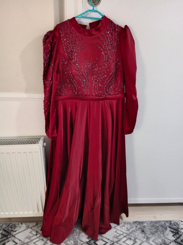 Bordo renk, yüksek yakalı ve uzun kollu işlemeli abiye elbise. Salaş kesim ve drapeli, parlak kumaştan yapılmıştır, düğünler için uygundur.