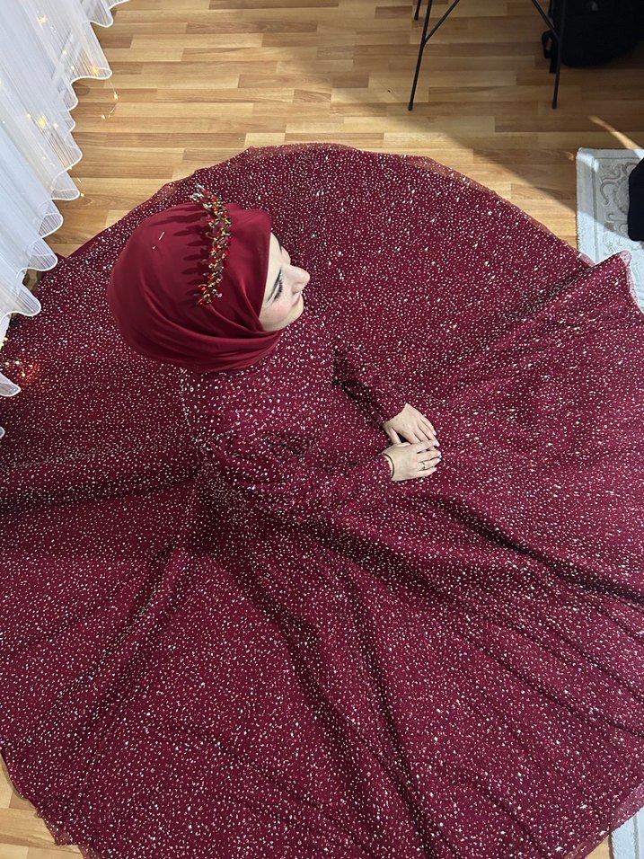 Parlak bordo renkte, uzun kollu, yüksek yakalı ve işlemeli detaylara sahip abiye elbise. Oturan kesimi ve drapeli eteği ile düğünler için uygun.