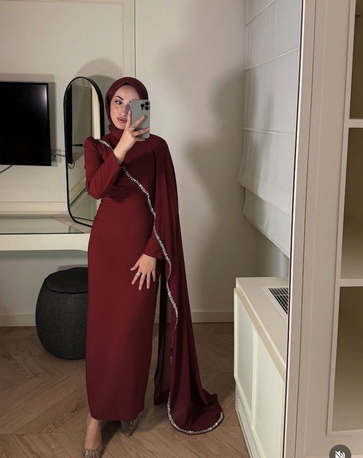 Bordo renkli, uzun kollu ve yüksek yakalı bu abiye elbise işlemeli detaylara sahiptir. Drapeli tasarımı ve regular fit kesimiyle mütevazı ve gösterişli bir görünüm sunar.✨