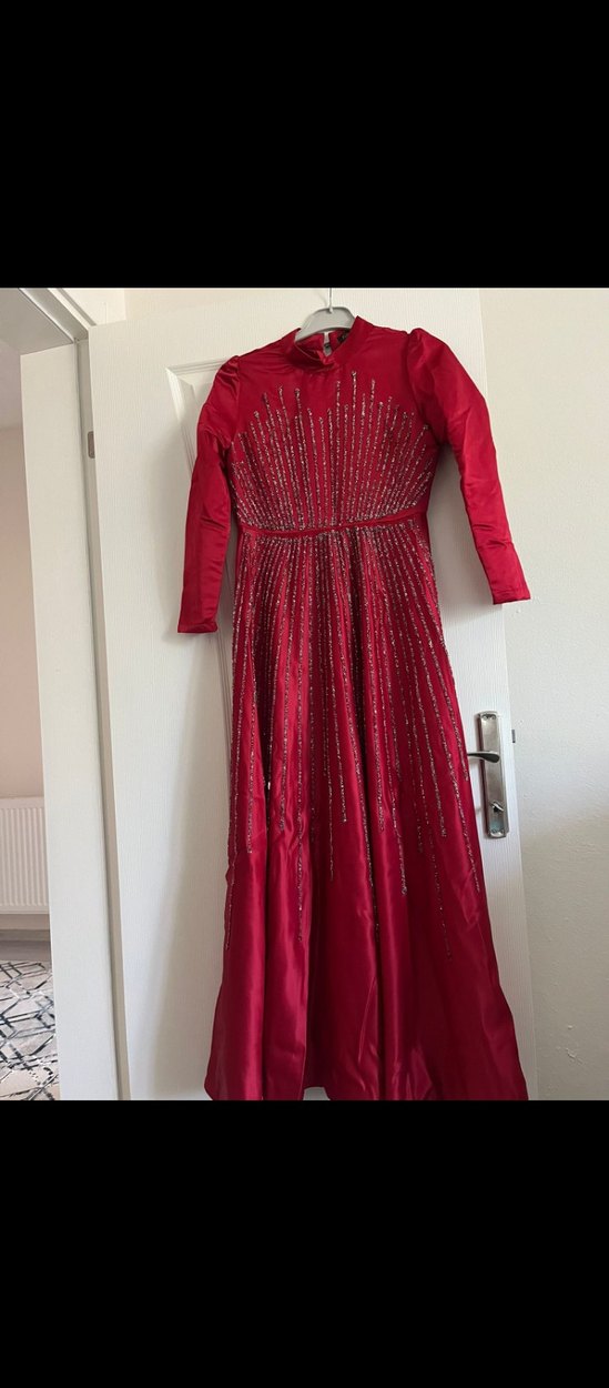 Bordo renkli, işlemeli, uzun kollu, drapeli ve yüksek yakalı klasik kesim abiye elbisedir. Uzun boyu ve parlak detaylarla düğünlere uygundur.