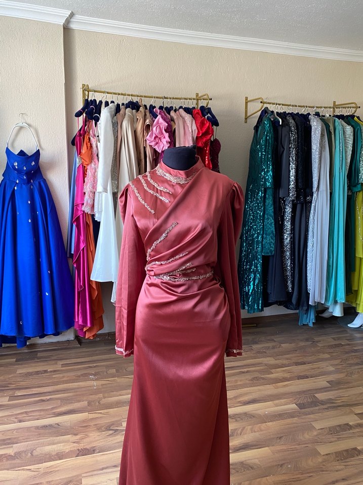 Bordo renkli, yüksek yakalı ve uzun kollu, işlemeli detaylara sahip bu uzun abiye elbise, düğünler için uygun parlak ve drapeli tasarıma sahiptir.