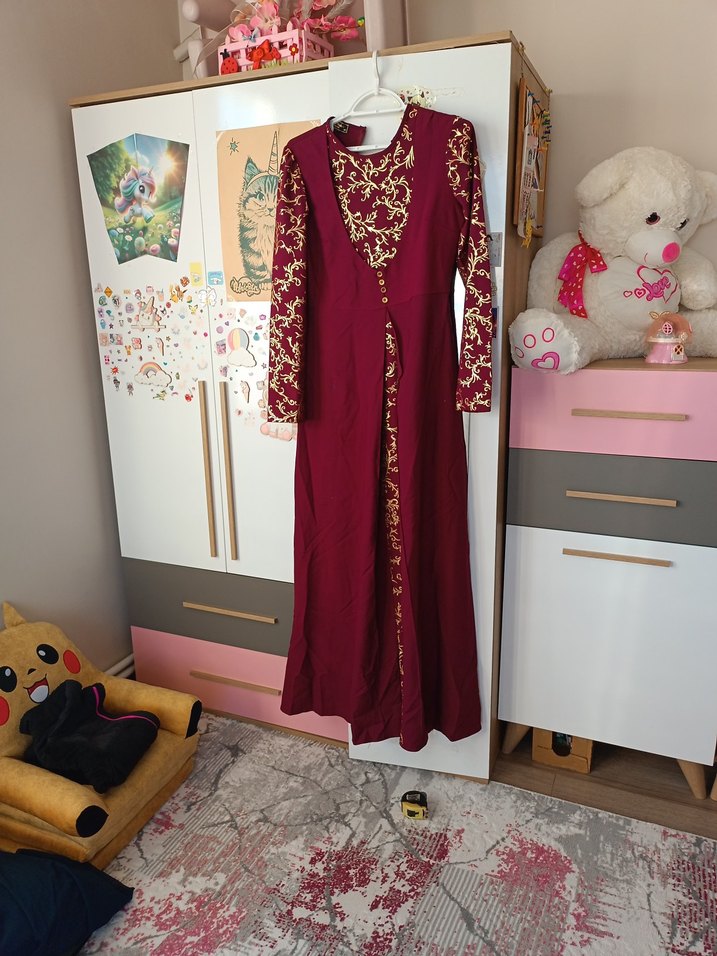 Bordo renkli, işlemeli ve dökümlü tasarıma sahip uzun, bol kesim elbise. Uzun kollu ve kesik yakalı, ipeksi kumaştan, düğünler için uygun.