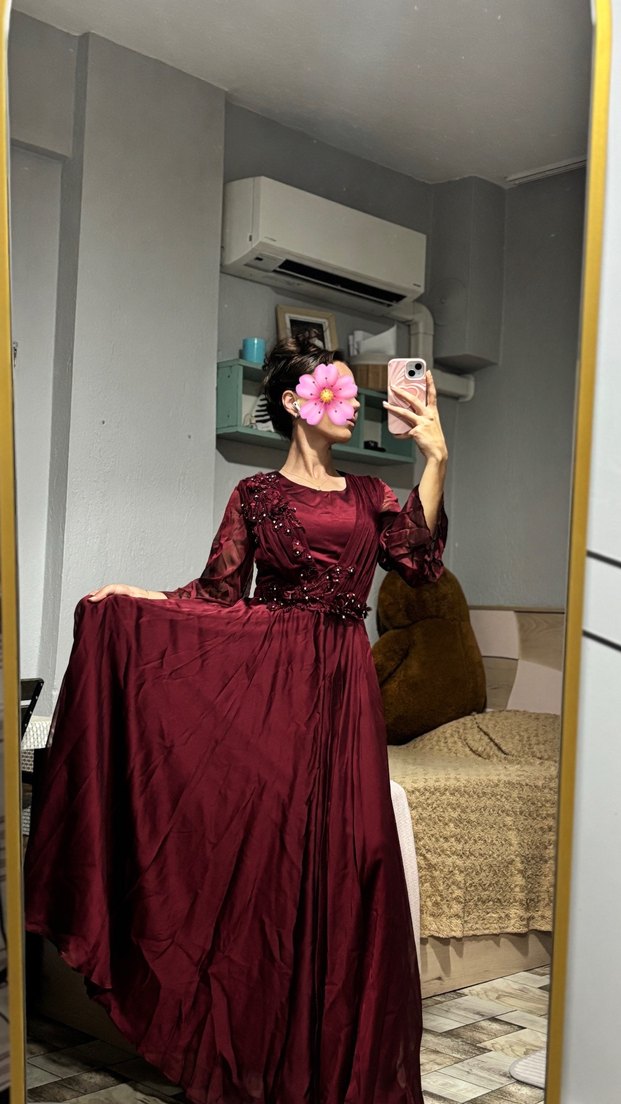 Boyum 157, kilom 45. Elbise 55 kiloya kadar çok rahat olur ben giydiğim de 4 5 kg daha fazlaydım. Belden oturmalı. bordo renkli, işlemeli ve dökümlü tasarıma sahip, uzun kollu belden oturmalı, bol kesim uzun boy kadın elbisesi. Düğün için şık ve bohem tarzda. 7 ve 8. fotoğrafta kusurunu gösterdim. Konfeti patlattıkları için ufak minicik kusur oldu. Onun haricince bir kusuru yok. Siz isterseniz elbiseyi terzide de farklı bir tasarım haline getirebilirsiniz. Kumaş güzel. Geçen sene 4900₺ aldım En son fotoğrafta ütülü hali var. Abiye kına düğün elbisesi