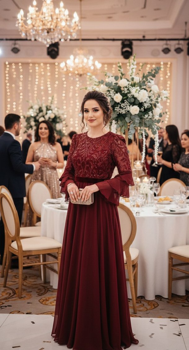 Bordo İşlemeli Uzun Kollu Kadın Abiye