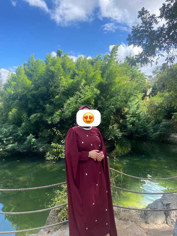 Bordo renkli, yüksek yakalı ve uzun kollu kadın abiyesi. İşlemeli detaylara sahip, bol kesim ve drapeli tasarımıyla sade ve mütevazı bir şıklık sunar. Şalıyla beraber olucak