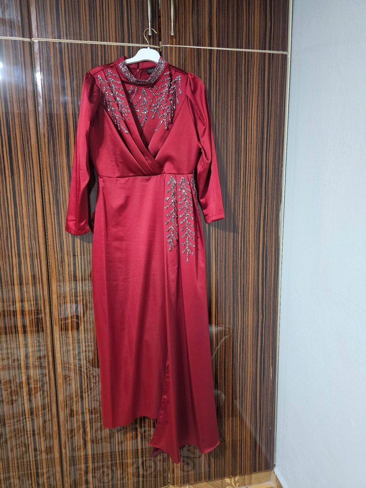 bir kere giyildi 3 saatliğine Bordo renkli, işlemeli ve drapeli detaylara sahip uzun kollu abiye elbise. tasarımı ile modest ve şık bir görünüm sunar. Düğün için uygundur. ✨