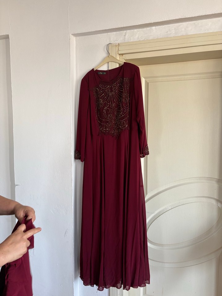 Bordo renkli, işlemeli detaylara sahip, uzun kollu ve salaş kesim kadın elbisesi. İpek gibi kumaşı ve drapeli tasarımı ile düğünler için uygun ve şalıyla birlikte verilmektedir.