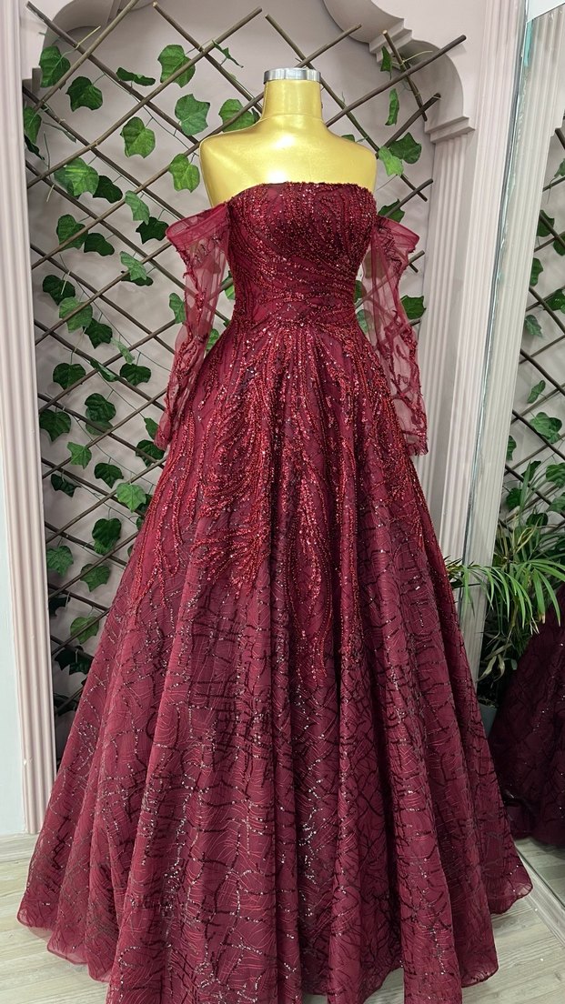 Bordo İşlemeli Uzun Kollu Straplez Abiye