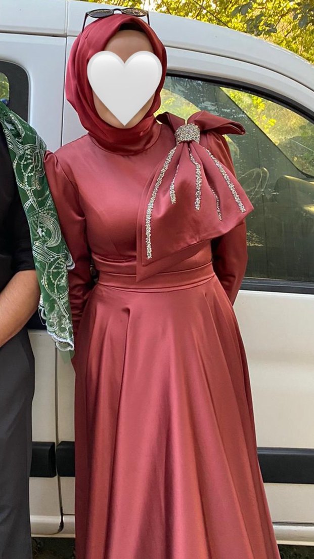 Bordo renk, yüksek yakalı, işlemeli, uzun kollu, drapeli, parlak kumaşlı ve fit kesimli abiye elbise, düğünler için uygun. Ufak tefek şeyleri var ama çok uyguna koyuyorum o yüzden pazarlık yapmıyorum.