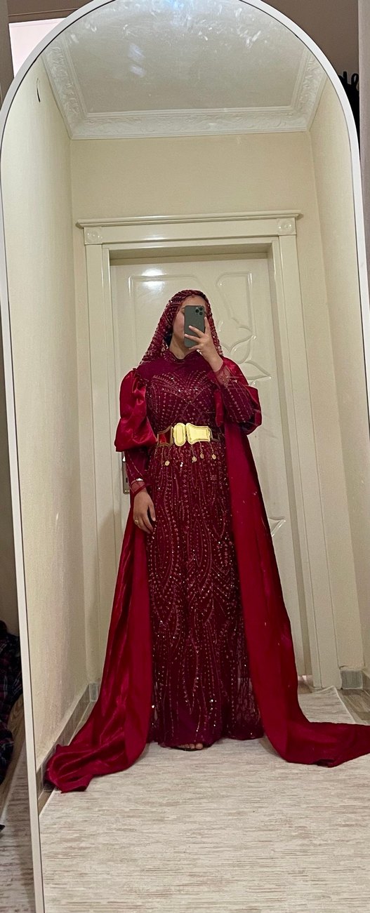 Bordo renkli, işlemeli, uzun kollu ve yüksek yakalı bindallı. Bol kesim ve dökümlü kumaş, düğünler için uygundur. ✨