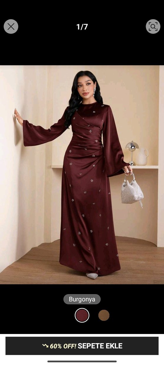 Bordo renkli, yüksek yakalı ve uzun kollu bu uzun elbise, drapeli kesime sahiptir. İpek gibi kumaştan yapılmış, işlemeli detayları ve parlak görünümüyle düğünler için uygundur.