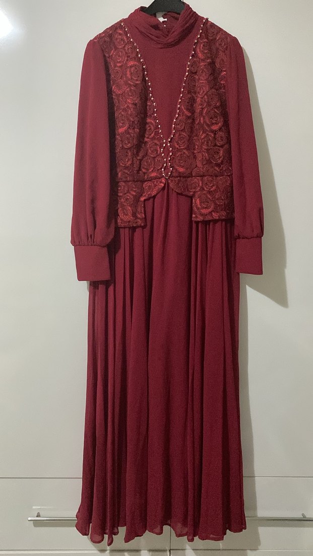 Bordo renkli, uzun kollu, yüksek yakalı ve işlemeli detaylara sahip vintage tarzda, bol kesim abiye elbisedir. Düğünler için uygundur.