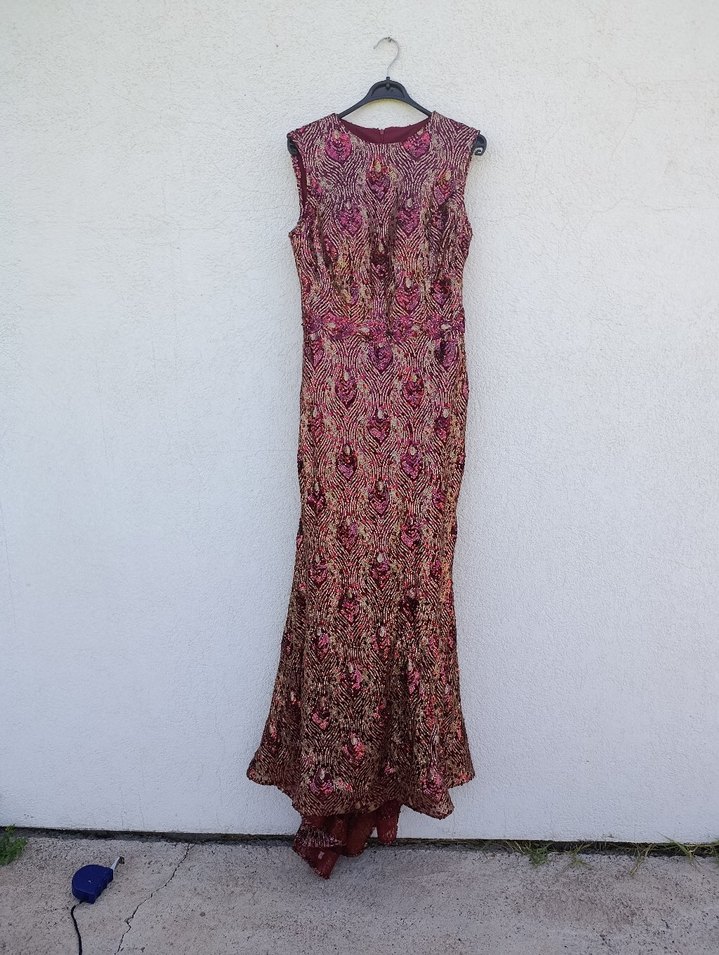 Kolsuz bordo abiye elbise, işlemeli detaylar ve drapeli kesimiyle dikkat çeker. V yakalı, uzun boylu ve bohem tarzda, düğün için uygundur. göğüs 43 cm boy 150,170