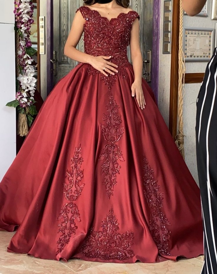 Bordo renkli, işlemeli kına elbise. V yaka ve kolsuz, klasik ve gösterişli bir tasarıma sahip. Kuru temizleme yapılmadı fiyatı düşüldü.