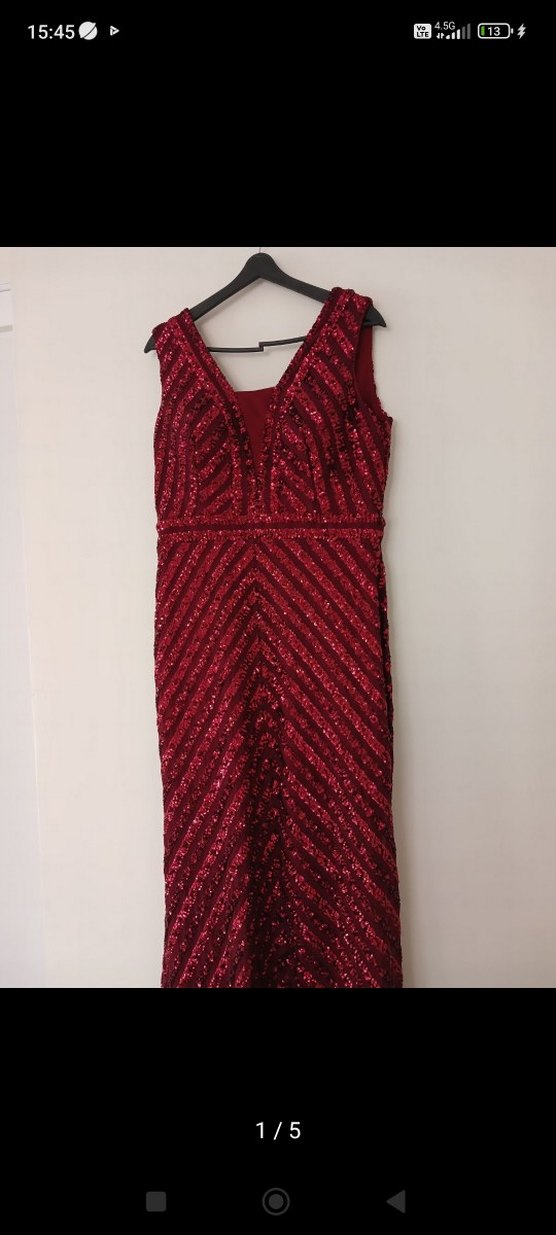 Bordo renkli, işlemeli ve parlak dokulu, drapeli V yakalı, uzun ve dar kesim abiye elbise. Parti için cesur bir tercih. ✨1.75 boy 80 kilo ile giydim