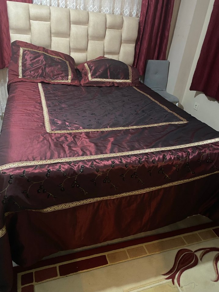 Koyu bordo renkli, işlemeli yatak örtüsü ve uyumlu yastık kılıfları, yatak odasına şıklık katıyor yırtık söküğü ve sayri yok.