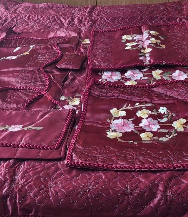 Koyu bordo renkli, işlemeli çiçek desenlerine sahip, yumuşak ve zengin dokulu yatak örtüsü.çeyizliktir.. yatak örtüsü 3 tane yastığı seccadesi Kur'an kabı her şey vardır