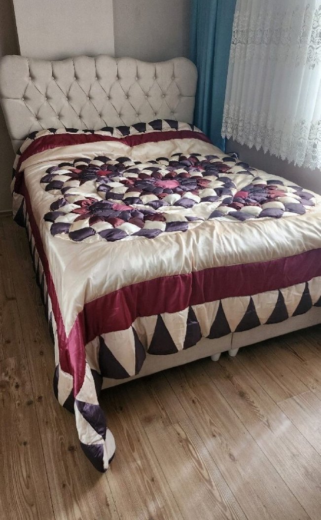Koyu bordo renkli, işlemeli desenlere sahip yatak örtüsü, yatak odasına dokulu ve sıcak bir görünüm kazandırır.Yatak örtüsü 1000