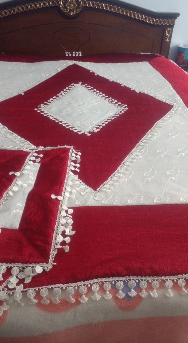 Bordo parlak renkte, işlemeli desenlere sahip geleneksel tarzda yatak örtüsü seti. Beyaz işlemeler ve süslü kenarlarıyla şık bir görünüm sunar. ️2 adet fon perde 3 kırlent ile kılınkır kumaş kirışmayan kullanışlı örtü