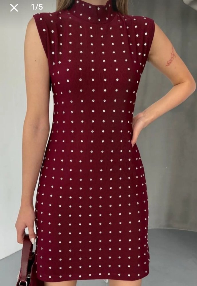 Bordo renkli, yüksek yakalı ve kolsuz, işlemeli puantiyeli bu dar kesim triko elbise midi boydadır. Yumuşak sentetik kumaştan üretilmiş, romantik akşamlar için uygundur.