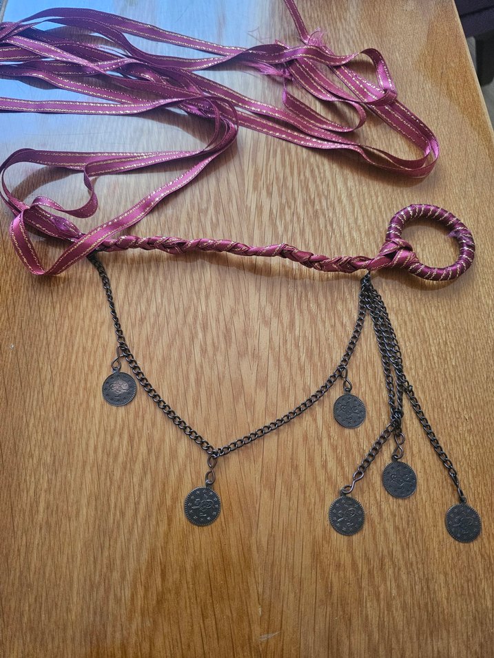 Bordo renkli, işlemeli ve bohem tarzda, madeni para detaylı zincirlerle süslenmiş kadın el zinciri. kemer kolye gibi aksesuar olarak kullanilabilir