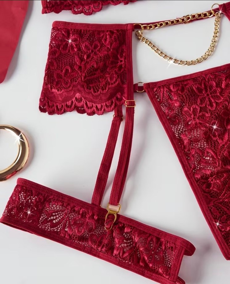 Bordo İşlemeli Zincir Detaylı Kadın Jartiyer Takımı