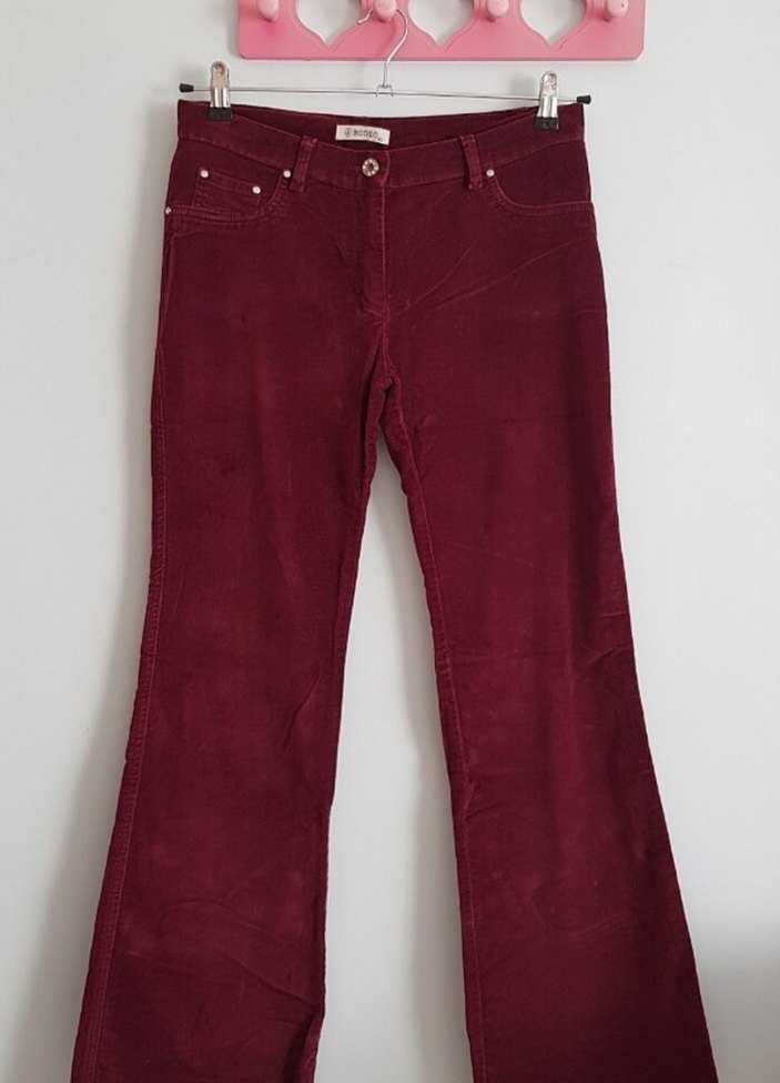 Bordo renkte, süet kumaştan yapılmış, düğmeli ve normal boy midi uzunluğunda kadın pantolonu. Rahat ve günlük kullanım için uygundur.