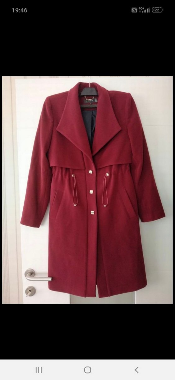 Yüksek yakalı, düğmeli bordo uzun kaban. Bel kısmında ayarlanabilir ip ve yan cepler bulunur. Yumuşak ve sıcak kumaştan üretilmiştir.