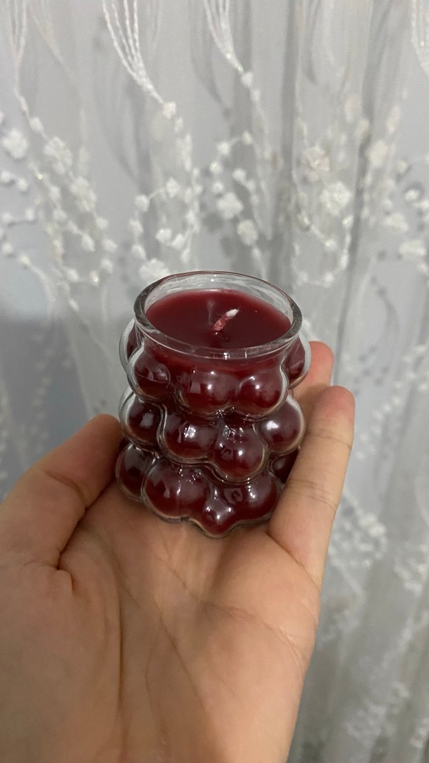 Bordo renkte, kabarcıklı cam tutucuda tasarlanmış dokulu ve derinlikli mum. ️