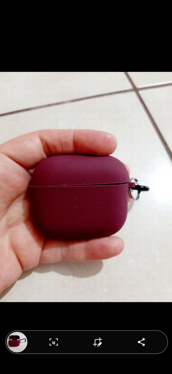 Kompakt tasarımlı, anahtarlık aparatı bulunan koyu bordo kablosuz kulaklık kutusu.
