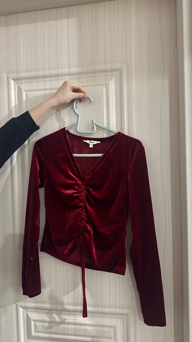 Bordo kadife kumaştan, uzun kollu ve v yaka, drapeli kesime sahip dar kesim bluz. Romantik akşamlar için şık ve trend sokak stili.