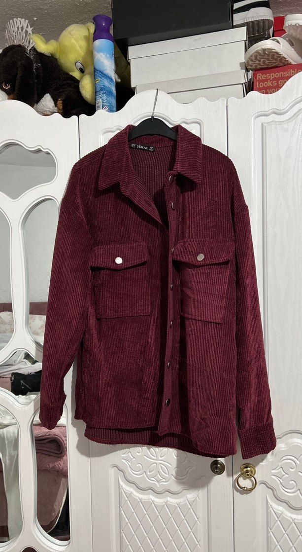 Bordo kadife gömlek, uzun kollu ve rahat kesimdir. Düğmeli cep detayları ve notched yaka bulunur. Midi boyda, günlük rahat stil için uygundur.